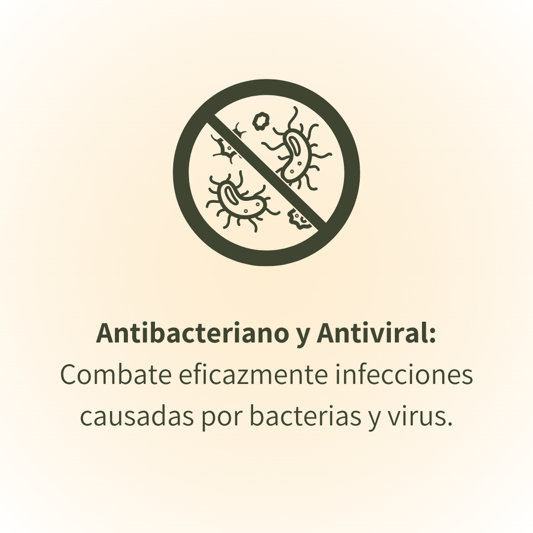 - Antibacteriano y Antiviral: Combate las infecciones, actuando como un agente natural contra bacterias y virus.