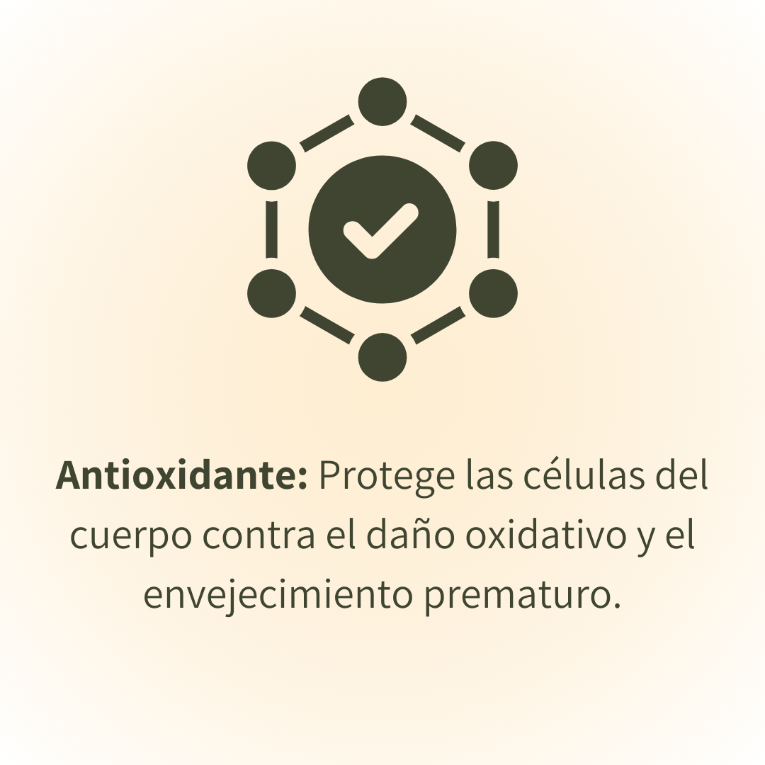- Antioxidante: Protege las células del daño oxidativo, lo cual ayuda a prevenir el envejecimiento prematuro y diversas enfermedades crónicas.