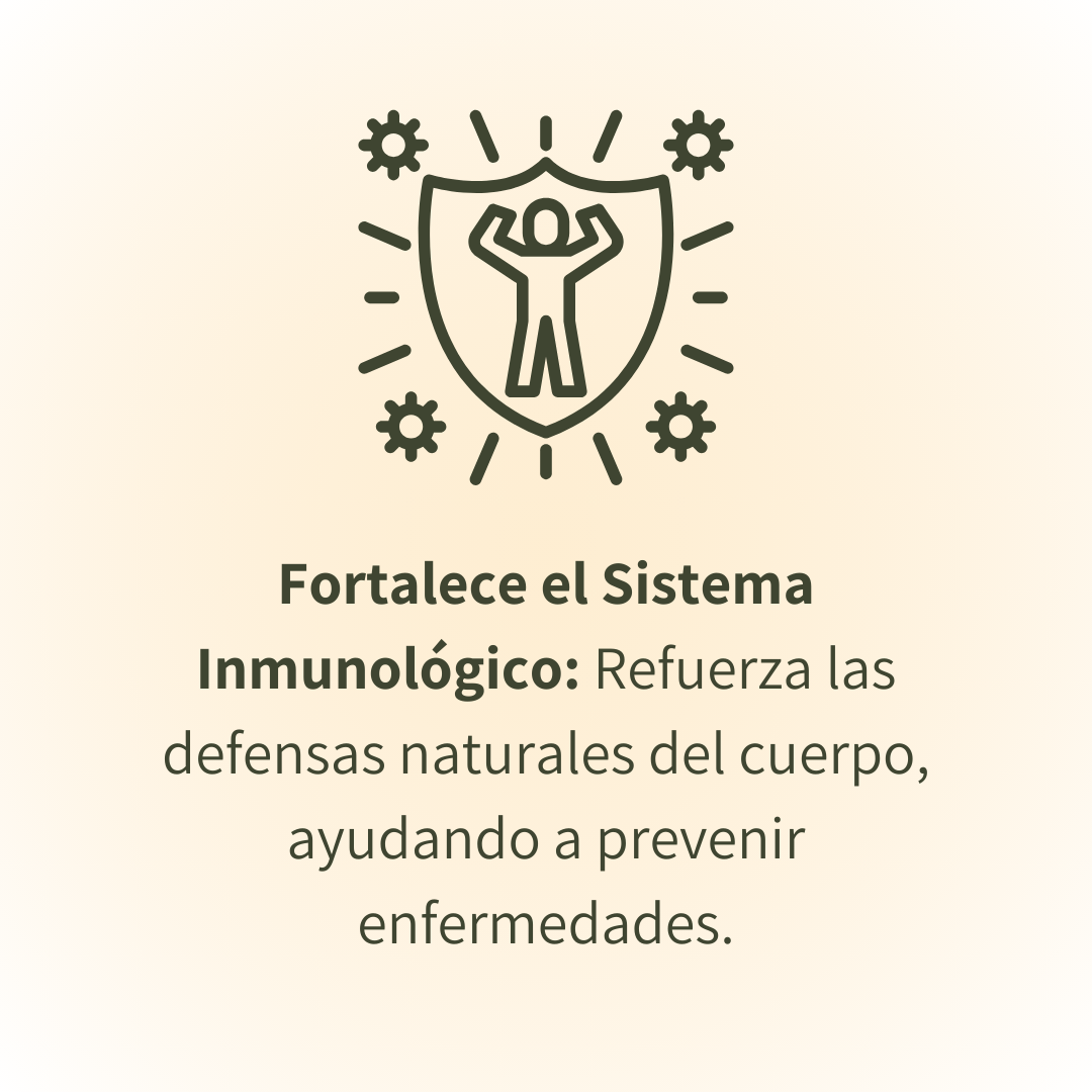 - Fortalecimiento del Sistema Inmunológico: Refuerza la defensa natural del cuerpo, ayudando a prevenir enfermedades y fortalecer el sistema inmune.