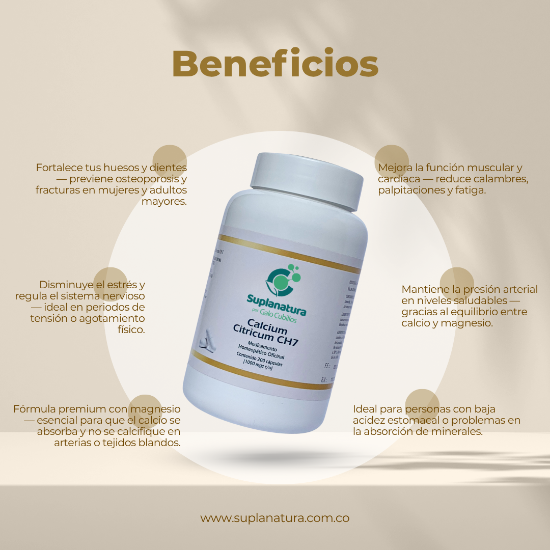 El Citrato de Calcio es esencial para mantener huesos fuertes y saludables, lo que ayuda a prevenir la osteoporosis y reducir el riesgo de fracturas a medida que envejecemos. Además, apoya la función muscular adecuada al facilitar la contracción y relajación de los músculos, lo que previene los calambres. También contribuye a la salud cardiovascular al ayudar a regular los latidos del corazón y la presión arterial. El citrato de calcio es fácil de absorber, incluso para personas con problemas digestivos o bajos niveles de ácido estomacal, asegurando que tu cuerpo obtenga el calcio que necesita.