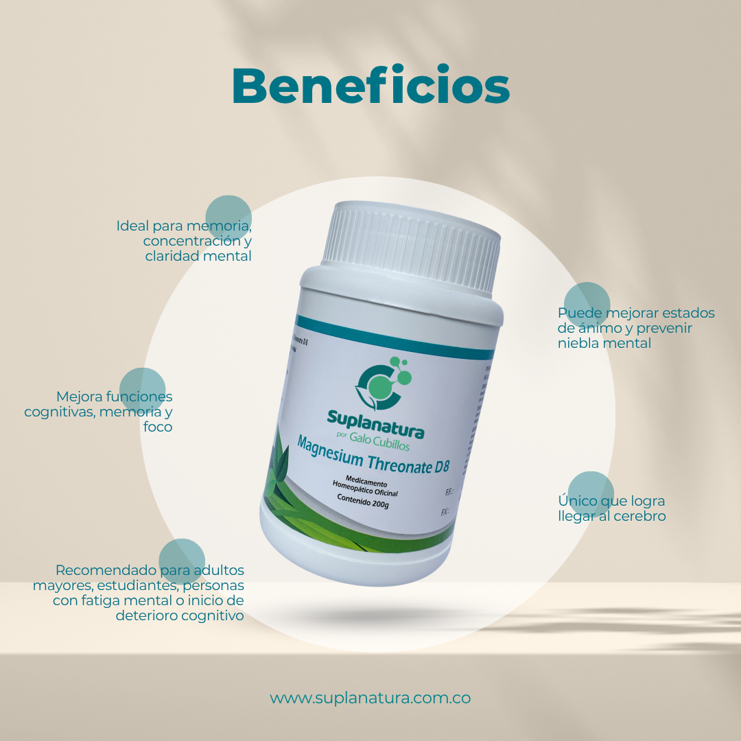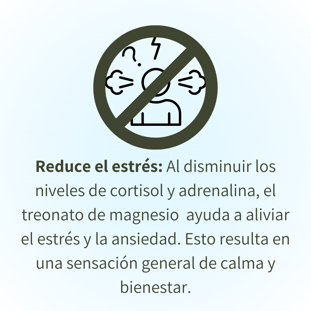 El Treonato de Magnesio es conocido por su capacidad de mejorar la función cerebral, ya que atraviesa la barrera hematoencefálica, ayudando a mejorar la memoria, la concentración y la claridad mental. También reduce los niveles de estrés al disminuir el cortisol y apoya la salud del corazón al regular la presión arterial y mejorar la circulación.