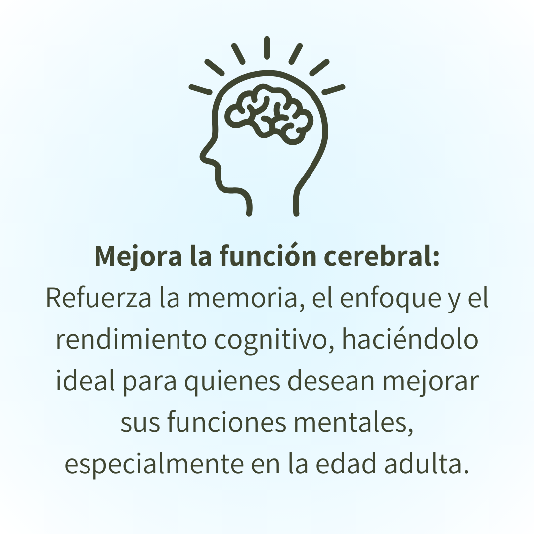- Mejora cognitiva: Penetra eficazmente en el cerebro, ayudando a mejorar la memoria, el aprendizaje y la función cognitiva.