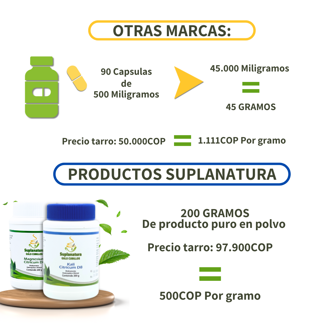 Nuestro Citrato de Magnesio está hecho con materias primas de la más alta calidad, 100% natural, sin aditivos ni rellenos, ofreciendo un contenido neto mayor en comparación con los productos típicos del mercado.